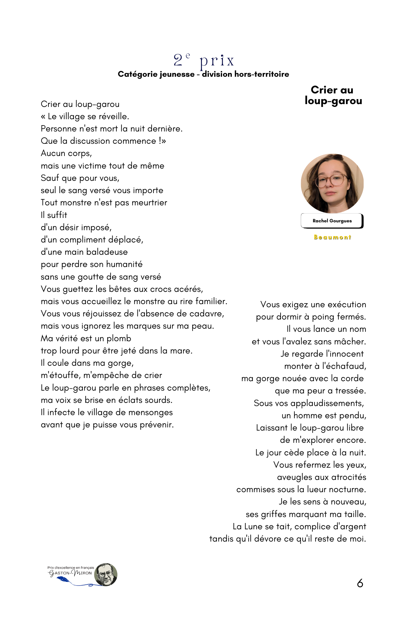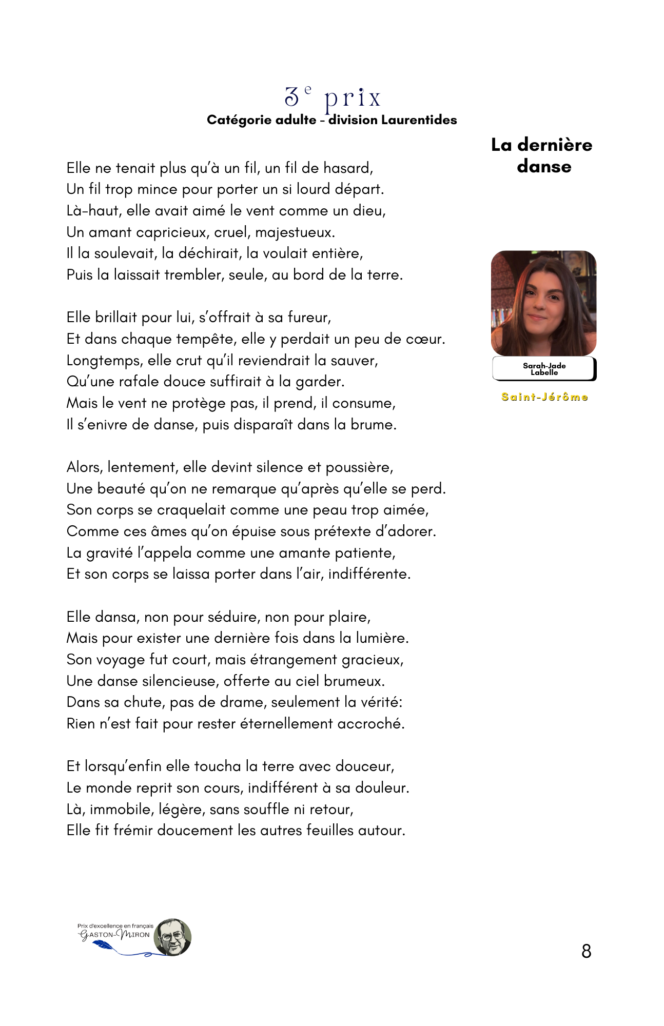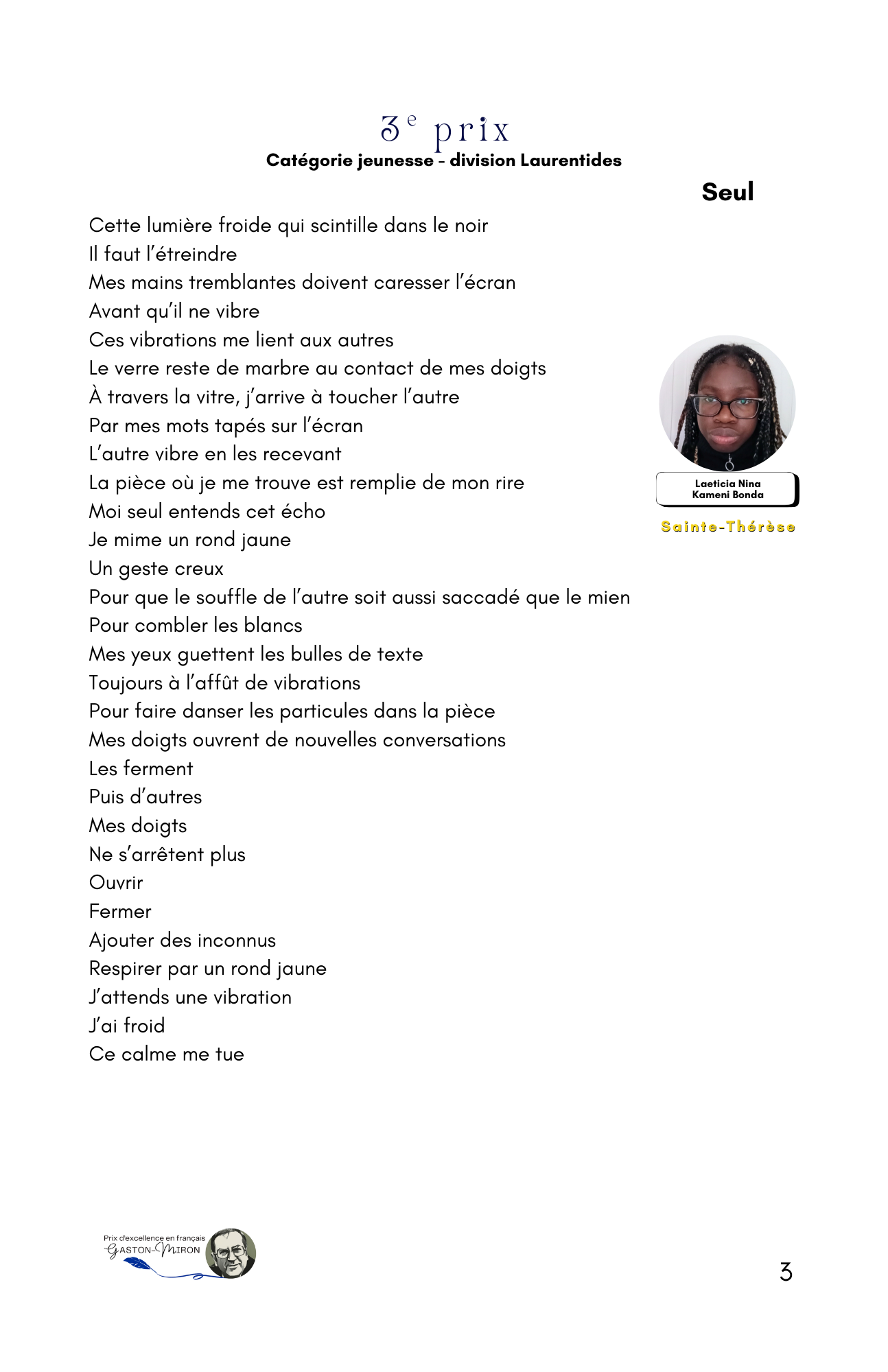 Trois cent cinquante-quatre jeunes et adultes en provenance de cent douze municipalités nationales ont répondu à l’appel de l’écriture, faisant de l’auditorium Geneviève-Guèvremont du Cégep de Saint-Jérôme le théâtre de la poésie en vers et en prose récitée de façon classique ou slamée devant une salle de plus de 200 personnes.