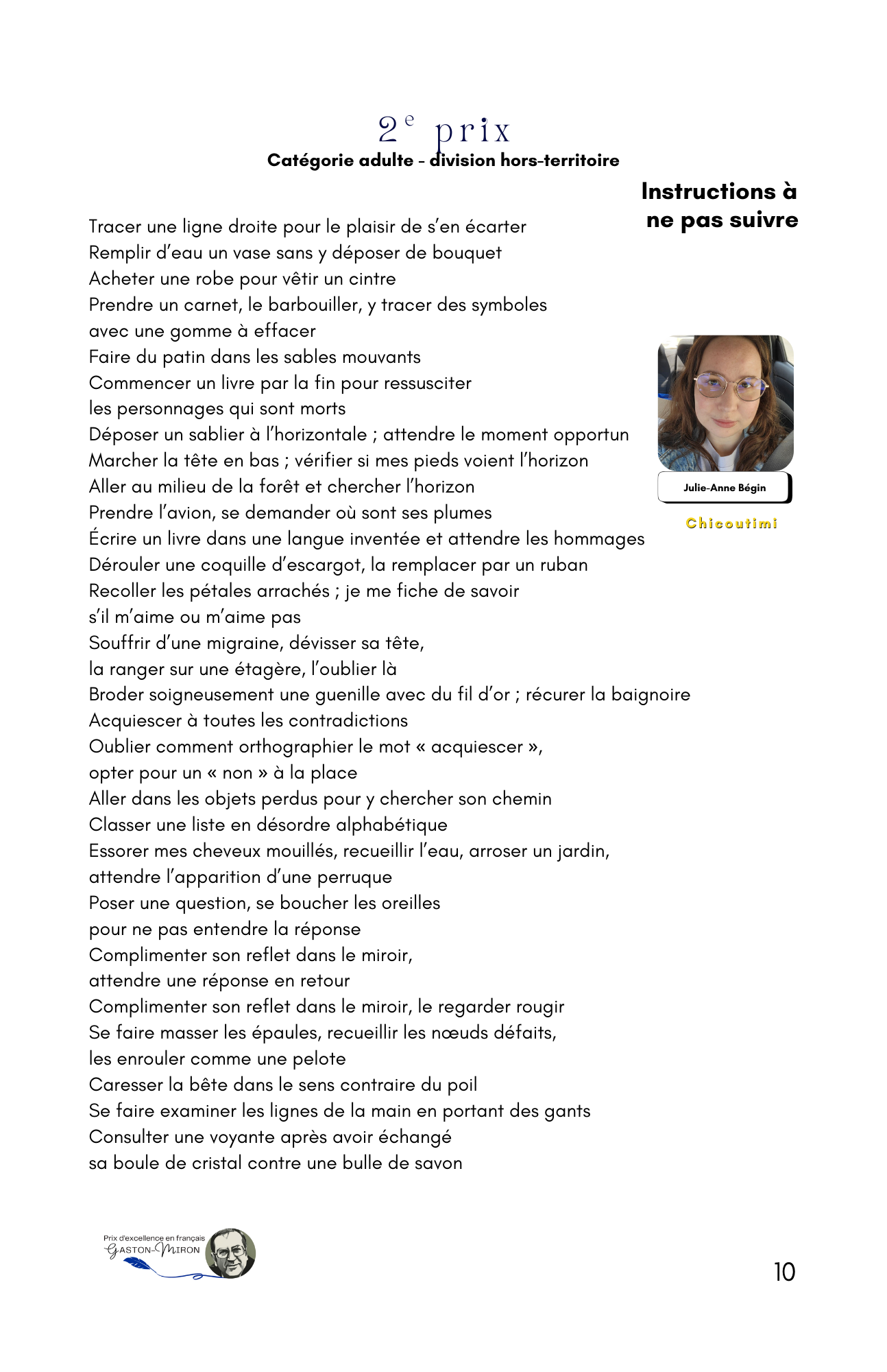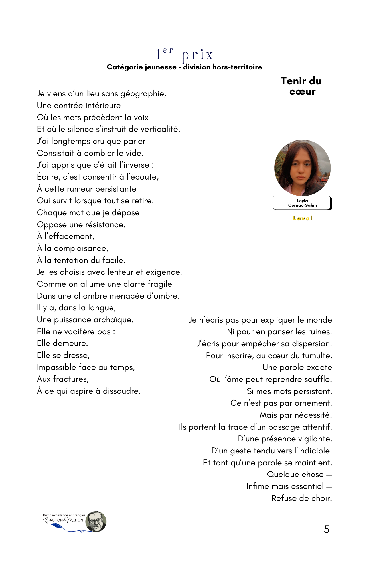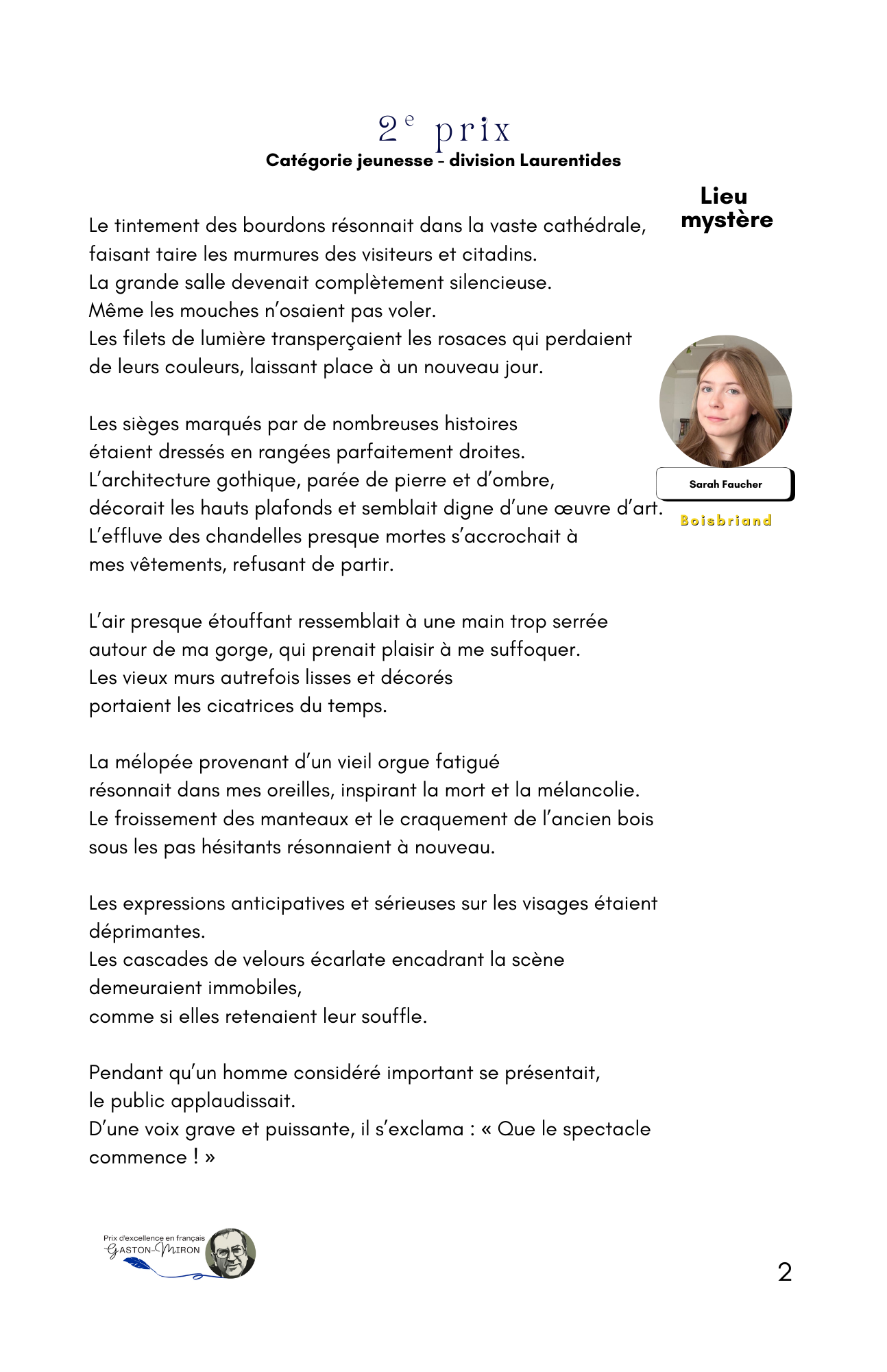 Trois cent cinquante-quatre jeunes et adultes en provenance de cent douze municipalités nationales ont répondu à l’appel de l’écriture, faisant de l’auditorium Geneviève-Guèvremont du Cégep de Saint-Jérôme le théâtre de la poésie en vers et en prose récitée de façon classique ou slamée devant une salle de plus de 200 personnes.